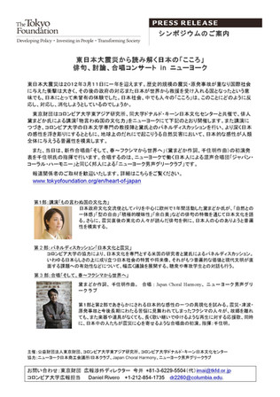 Ms. Madoka Mayuzumi, a Haiku poet, spent a year in Paris as part of Japan's Cultural Envoy program, sponsored by Japan's Agency for Cultural Affairs. Collaborating with Mr. Akira Senju, a composer, musical arranger, and producer, they composed a song dedicated to Fukushima. The piece was world-premiered by Japan's choral group Harmony "TOMO" and The Men's Glee Club of New York.